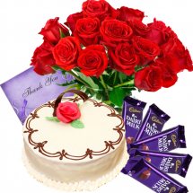 Balloons with 12 red roses Basket and 1/2 Kg Black Forest cake
